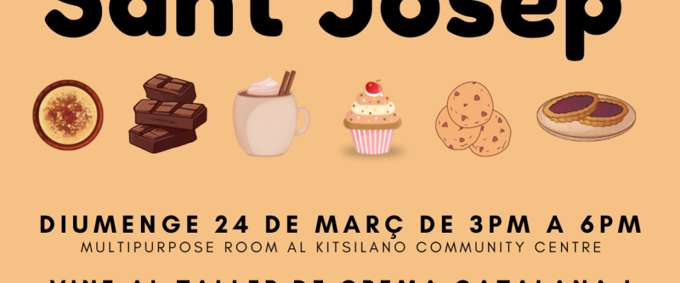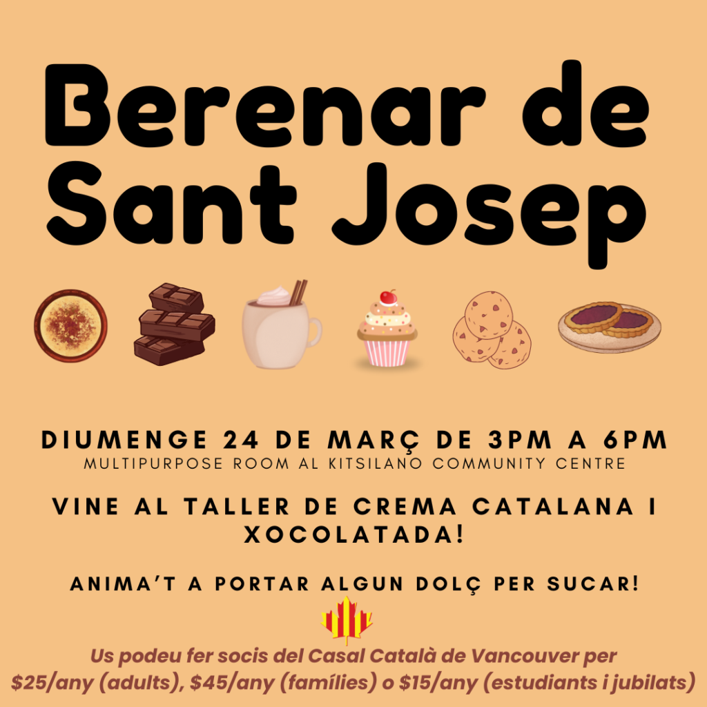Us esperem el diumenge 24 de març per menjar crema catalana i xocolata calenta! Anima`t a portar algun dolç per sucar! L`esdeveniment tindrà lloc de 3 a 6 a la Multipurpose room del Kitsilano Community Room (parking gratuït). Tant si ets nou per Vancouver o portes temps i vols fer arrels amb catalans i catalanes, vine, ens ho passarem molt bé!! Tothom és benvingut, i com sempre acceptarem donacions per ajudar-nos a cobrir les despeses del lloguer i menjar de l`activitat!veure tot »